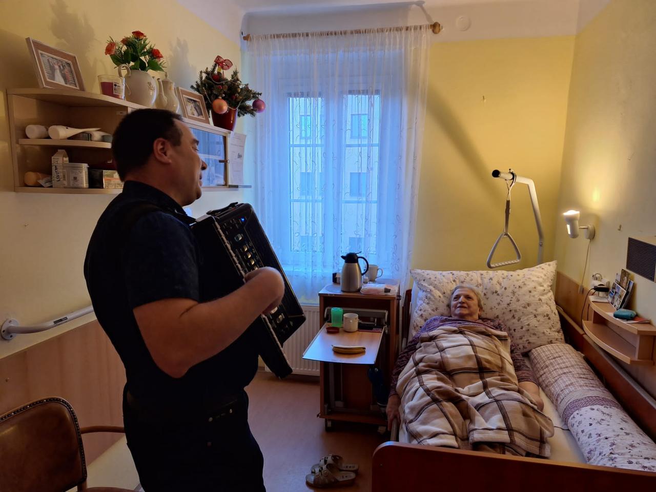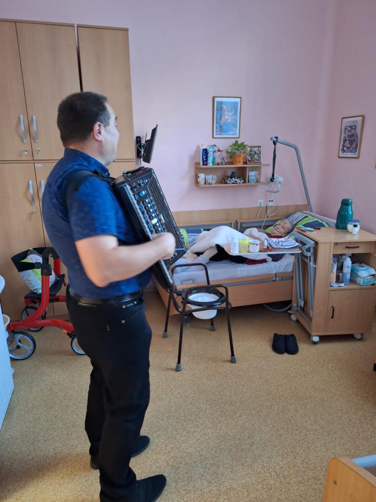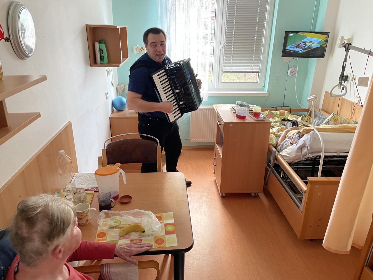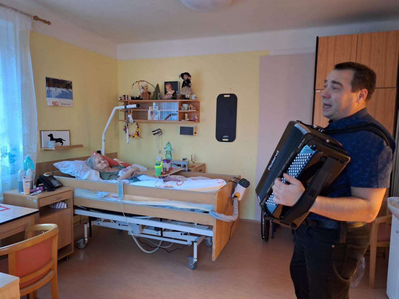 Hudební vystoupení pro naše klienty na pokojích. Je skvělé vidět, jak naše klienty pan harmonikář vždy potěší.