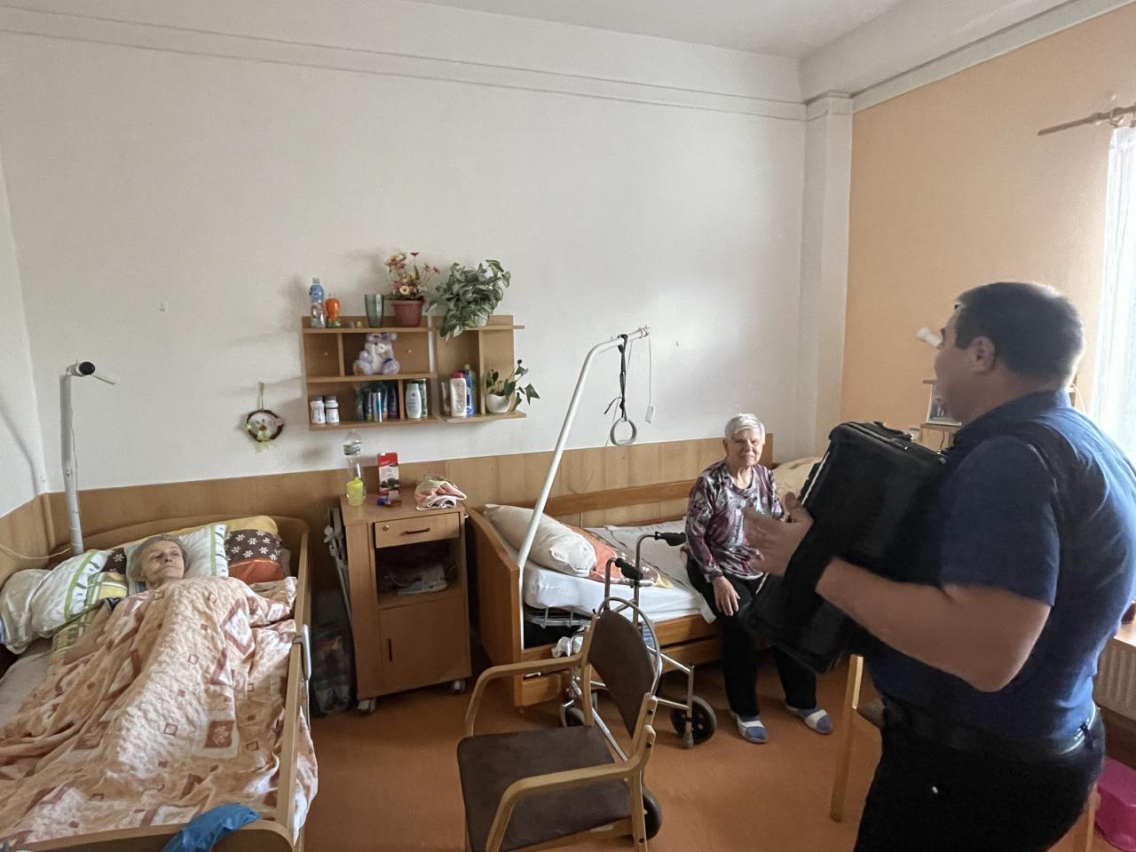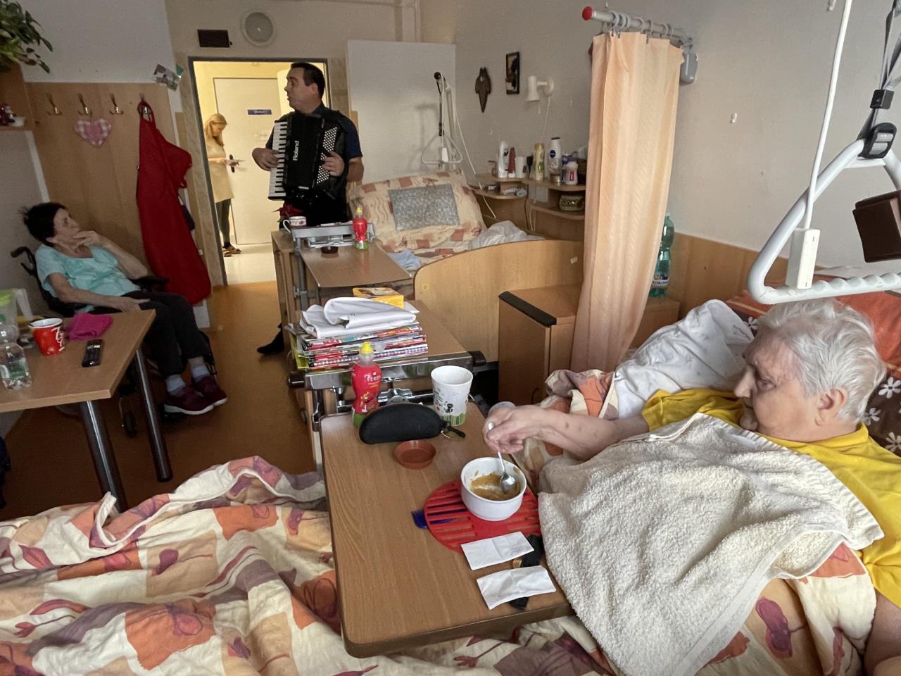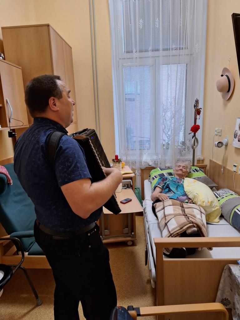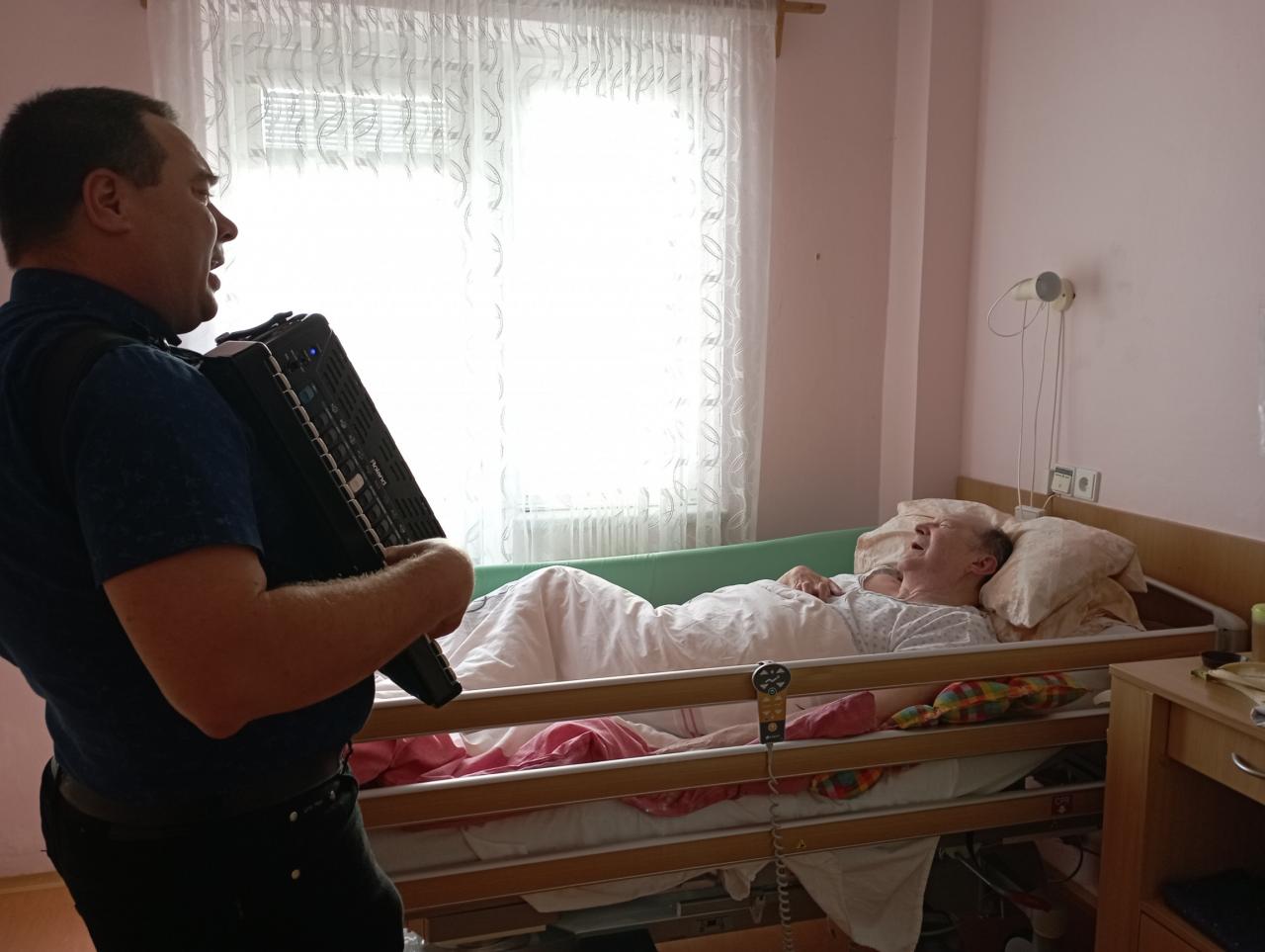 Hudební vystoupení pro naše klienty na pokojích. Je skvělé vidět, jak naše klienty pan harmonikář vždy potěší.