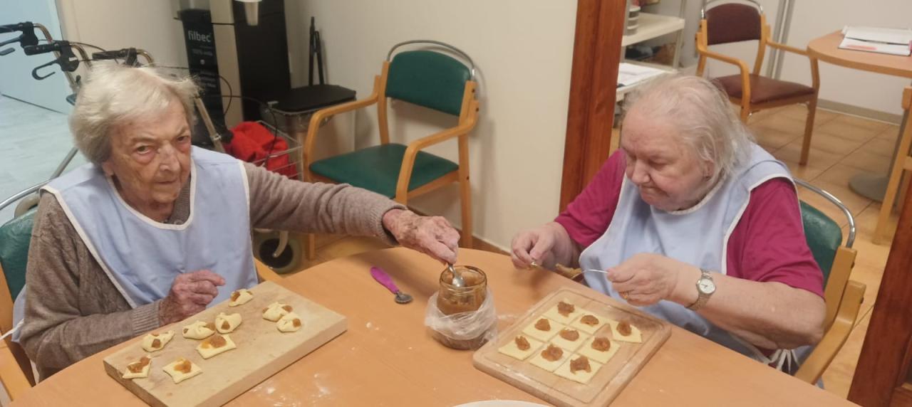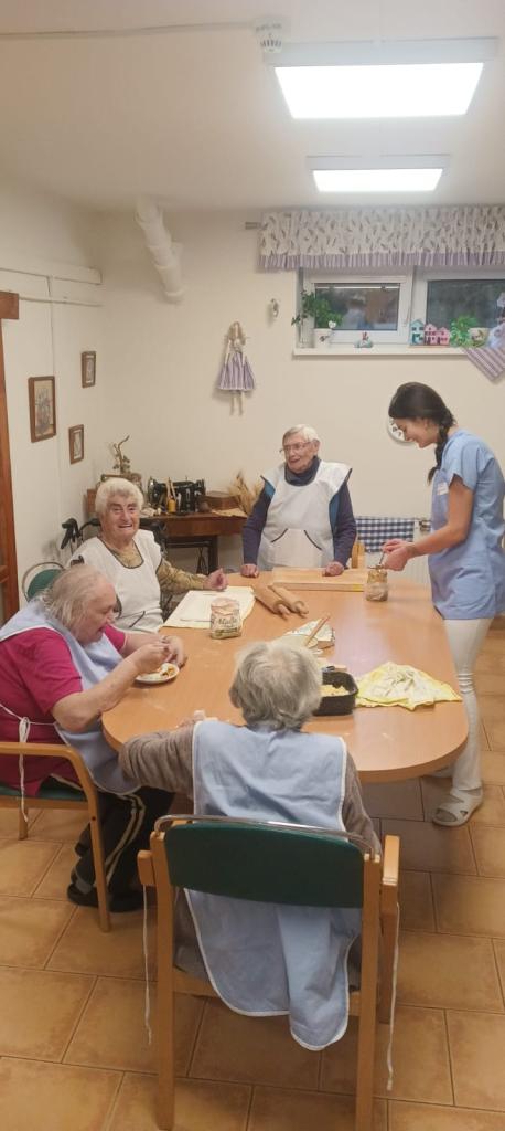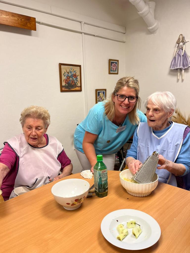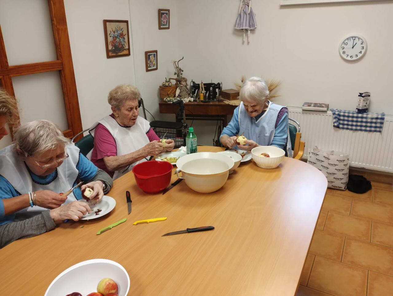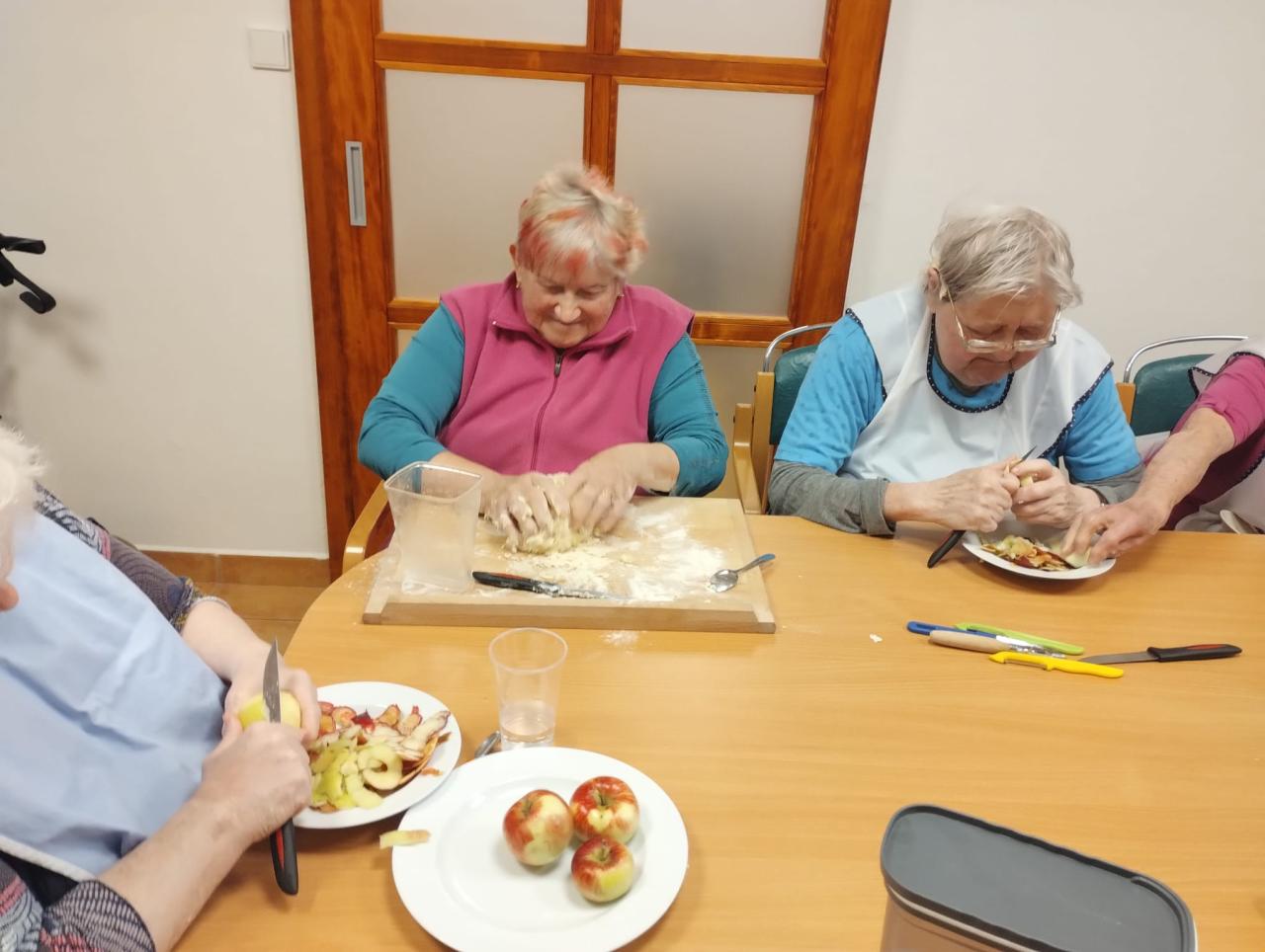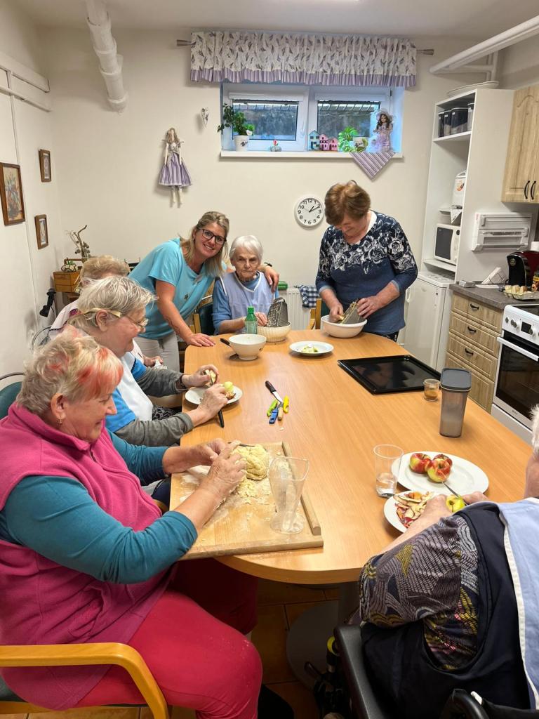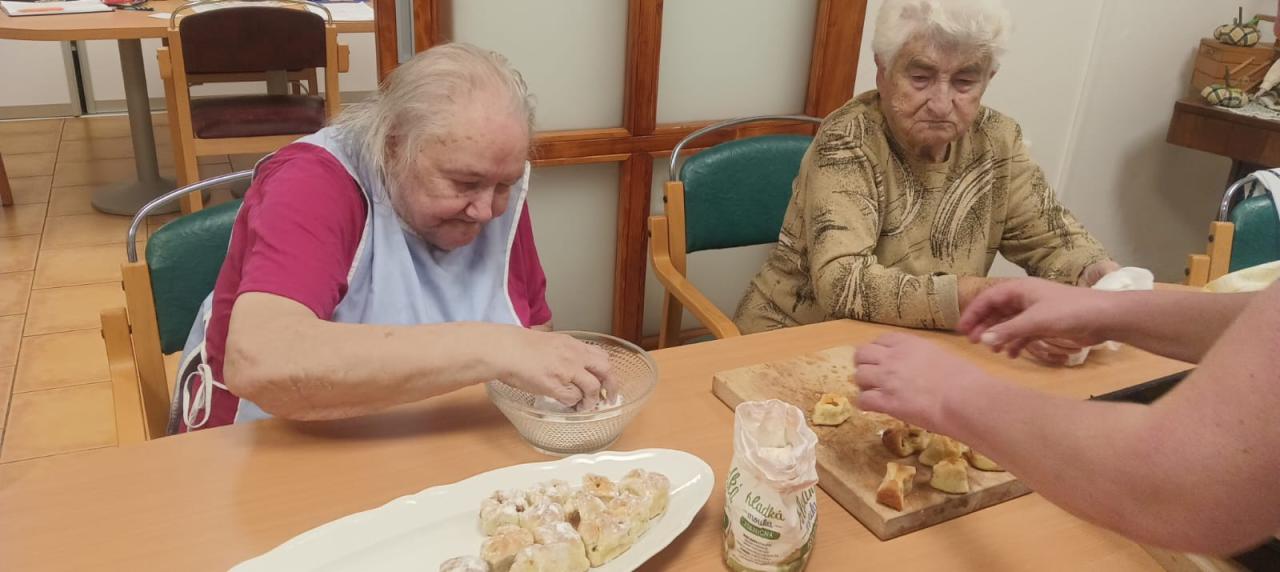 Jablečnou sezónu jsme zahájily štrůdlem, žemlovkou a koláčky s jablečnými povidly a tvarohem. Dokonalost sama a ta krásná vůně po domově... V hlavní roli naše šikovné dámy a aktivizační pracovnice.