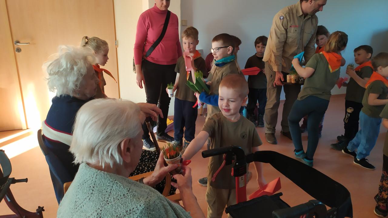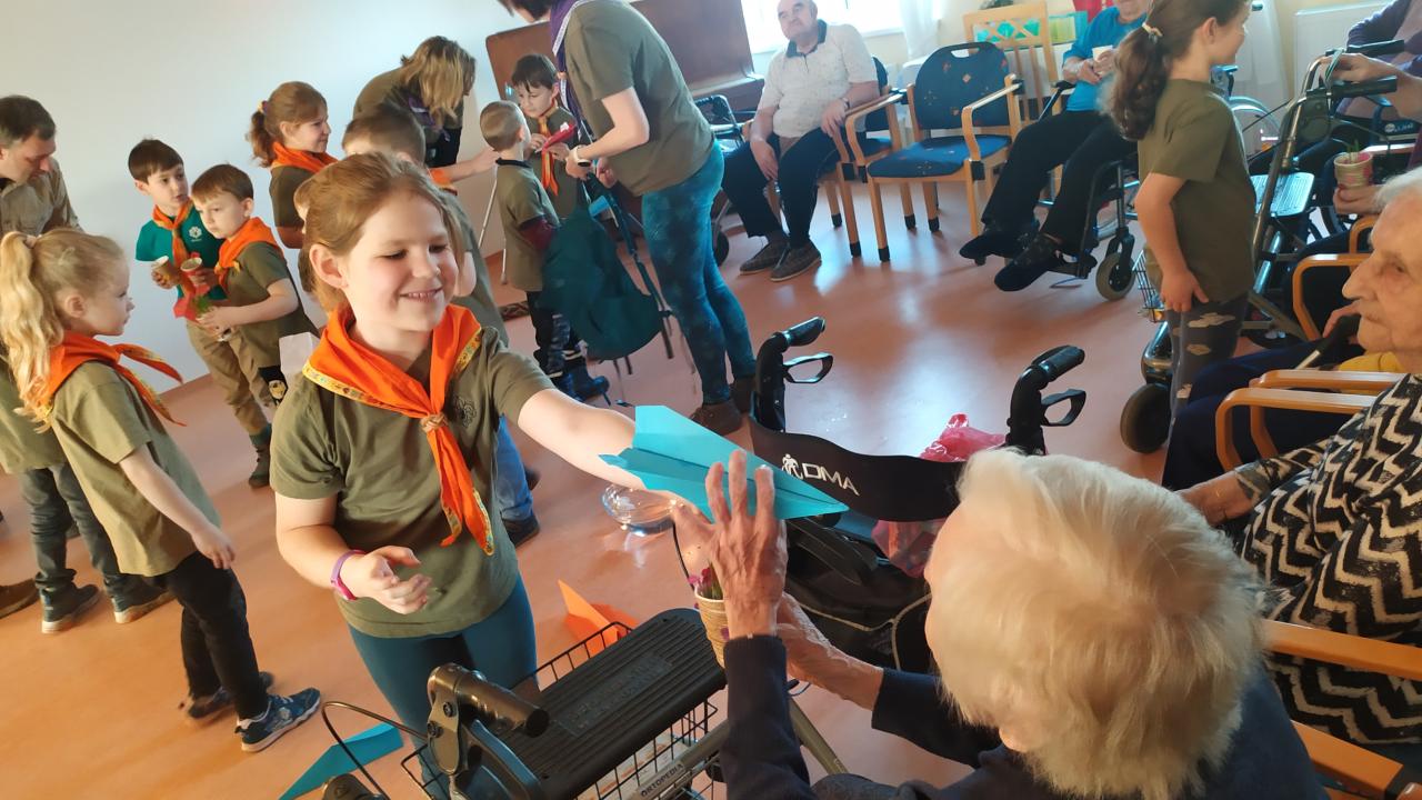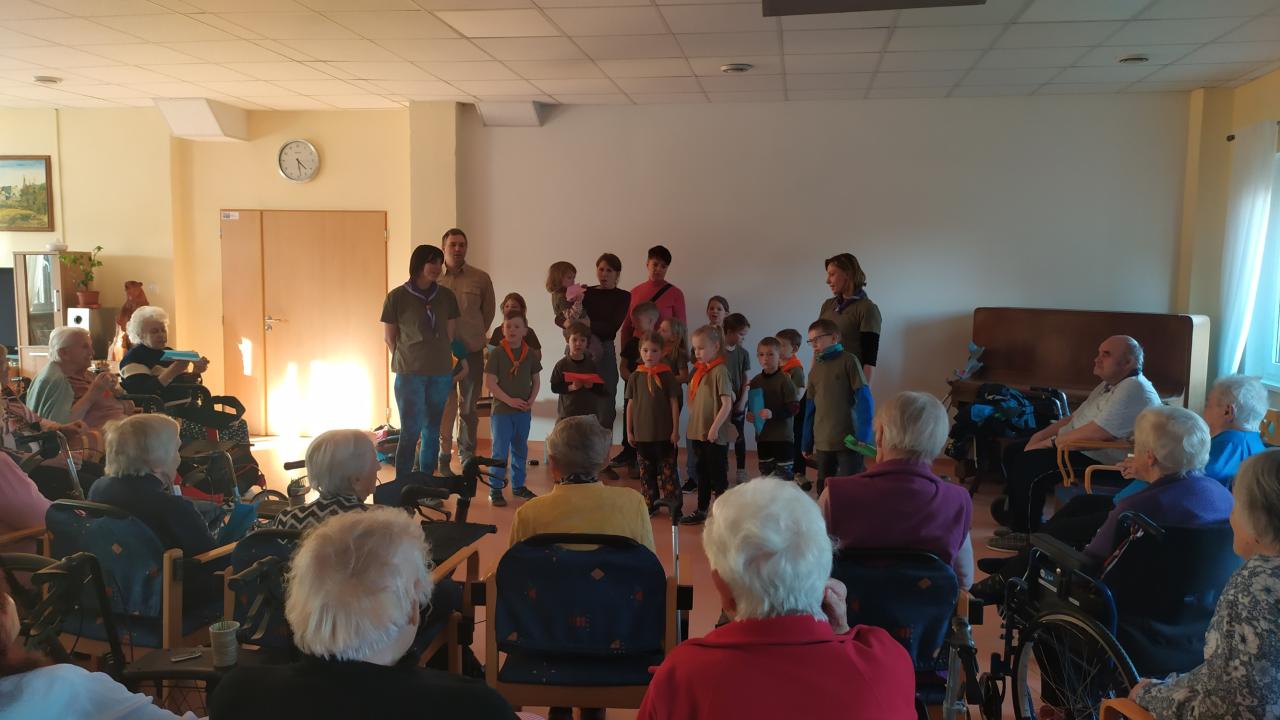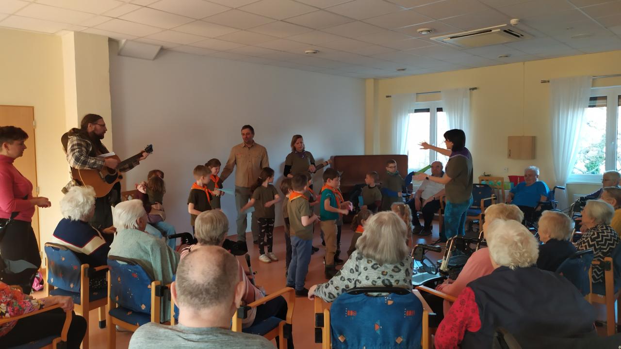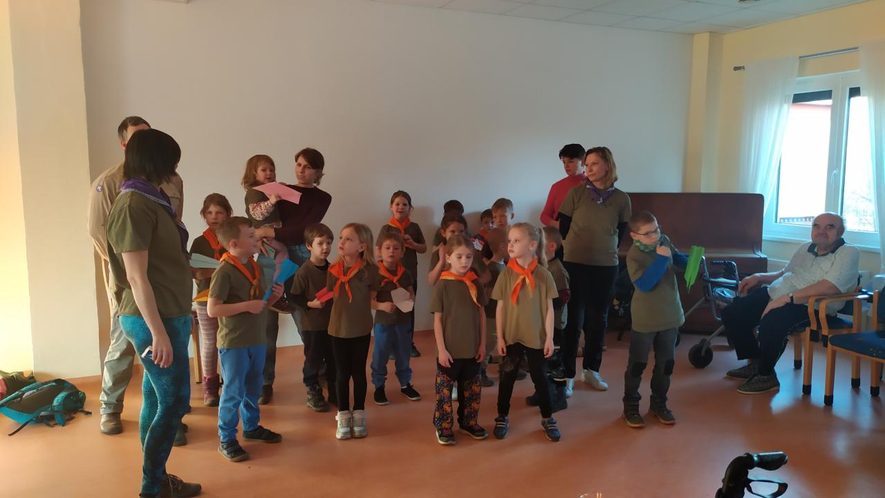 Skautky a skautíci v zelených tričkách - Benjamínci pod vedením Lenky Urbanové - nám dnes přišli zazpívat o přírodních živlech a povyprávět, jaká je čeká výprava.