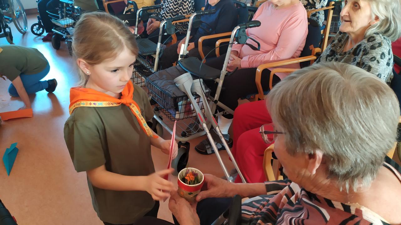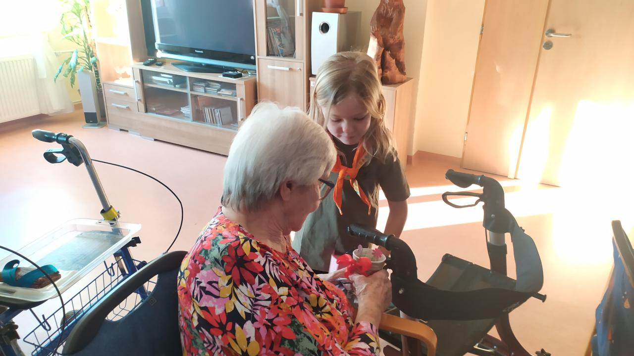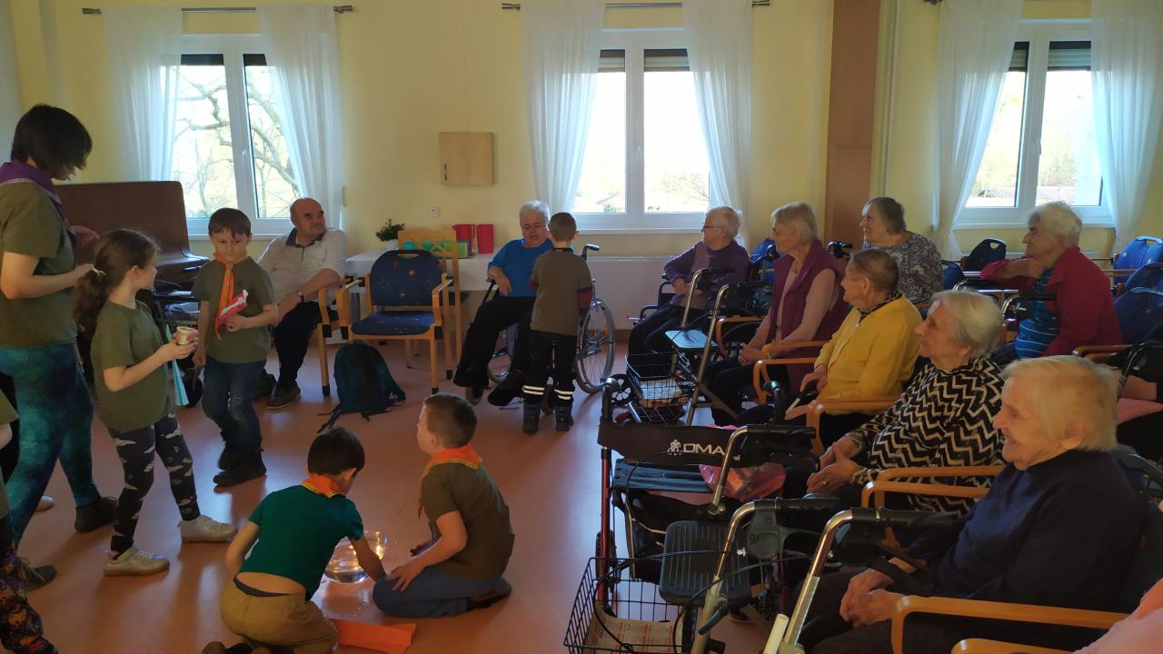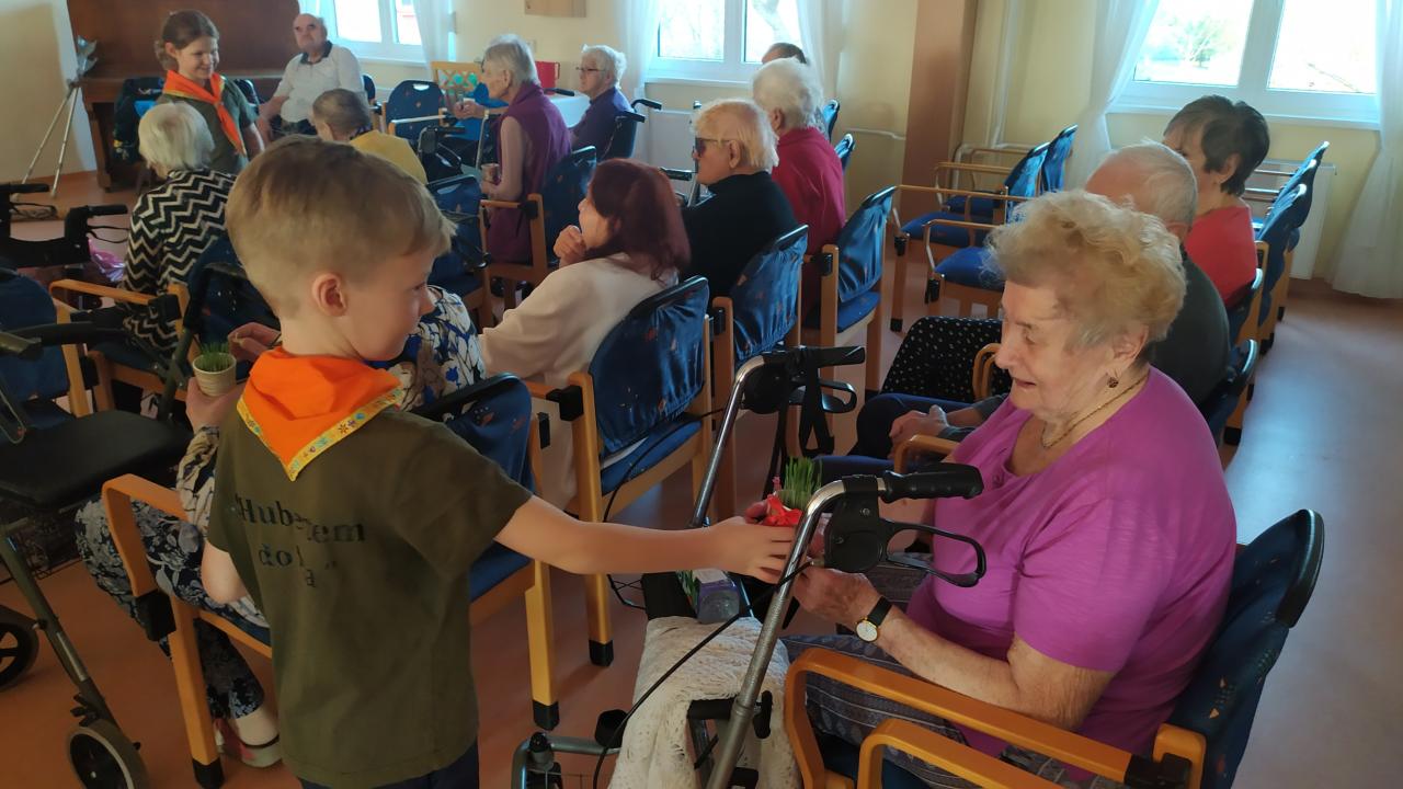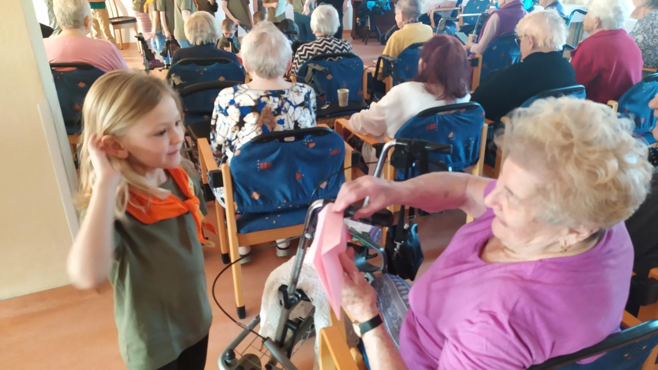 Skautky a skautíci v zelených tričkách - Benjamínci pod vedením Lenky Urbanové - nám dnes přišli zazpívat o přírodních živlech a povyprávět, jaká je čeká výprava.