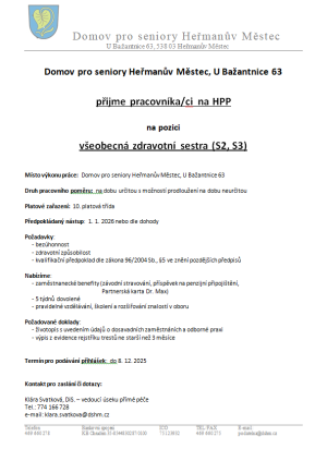 Domov pro seniory Heřmanův Městec, U Bažantnice 63, hledá pracovníka na pozici všeobecné zdravotní sestry. Nabízíme atraktivní platové zařazení v 10. platové třídě, zaměstnanecké benefity a možnost profesního vzdělávání. Předpokládaný nástup je 1. ledna 2026, nebo dle dohody. V případě zájmu zašlete
