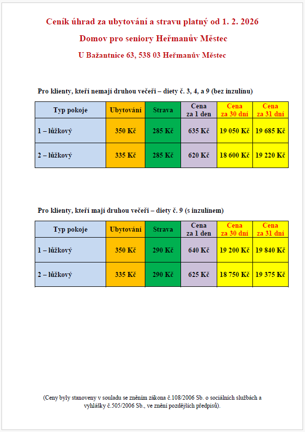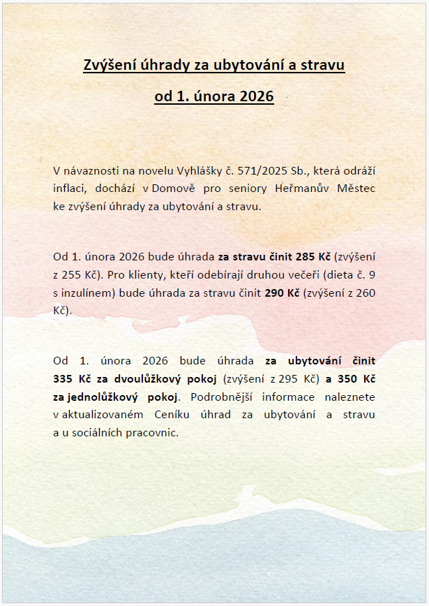 V Domově pro seniory Heřmanův Městec dojde k navýšení úhrad za ubytování a stravu v souladu s novelou Vyhlášky č. 571/2025 Sb.. Nové ceny vstoupí v platnost od 1. února 2026. Úhrada za stravu se zvýší na 285 Kč, přičemž pro klienty na dietě č. 9 s inzulínem bude činit 290 Kč. Cena za dvoulůžkový pokoj se zvýší na 335 Kč a za jednolůžkový pokoj na 350 Kč. Pro více informací je možné se obrátit na sociální pracovnice nebo nahlédnout do aktualizovaného ceníku.